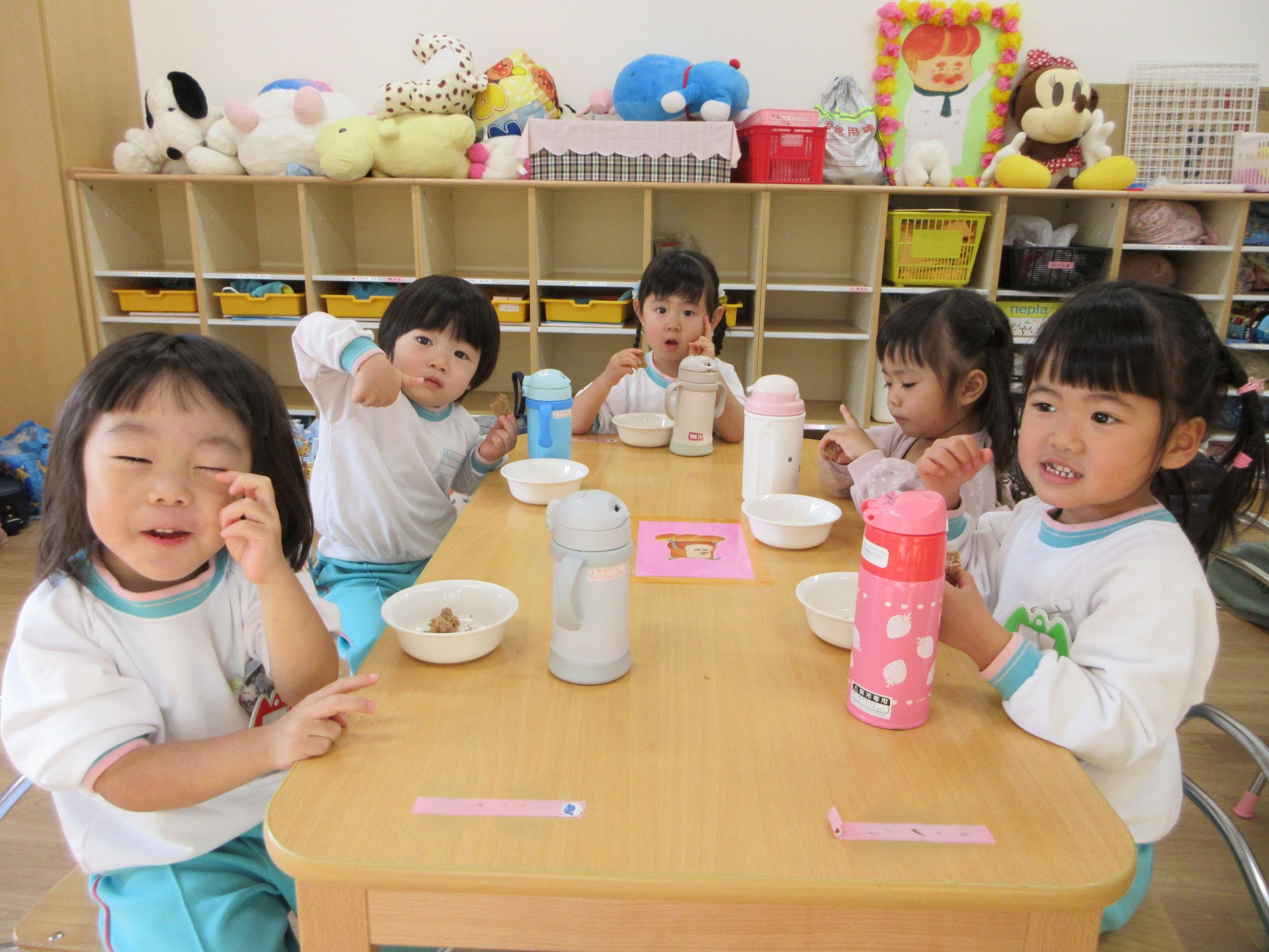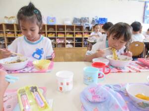生涯にわたる「食の基本」は、乳幼児期の大人とのかかわりが土台になります。みよし幼稚園に通う子は、保育教諭と給食をともにしながら、体の栄養と「食べることって楽しい、うれしい」といった意欲を育みます。一人ひとりの発達と心に沿った援助を確認し日々の保育に役立てています。