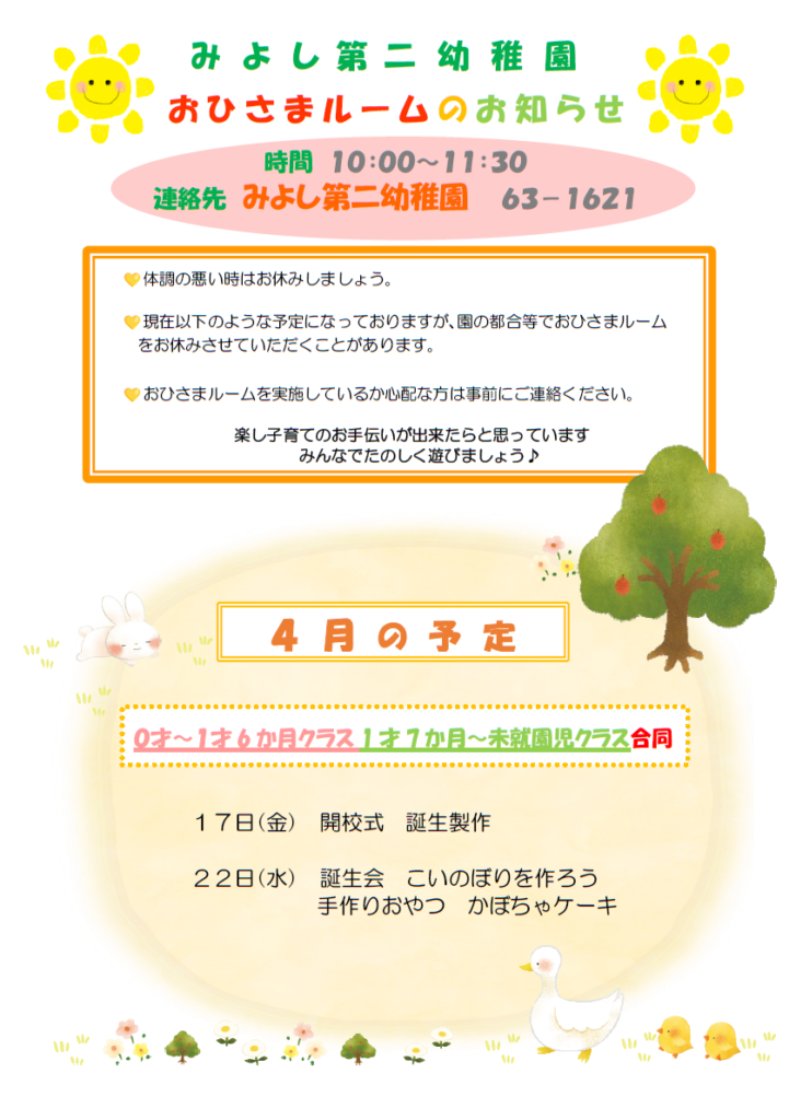 🐤4月のおひさまルームのお知らせ🐤(みよし幼稚園)