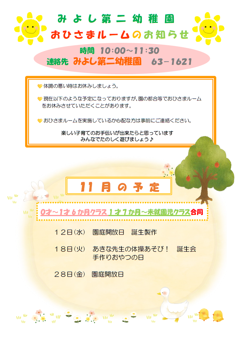 🐤11月のおひさまルームのお知らせ🐤(みよし第二幼稚園)