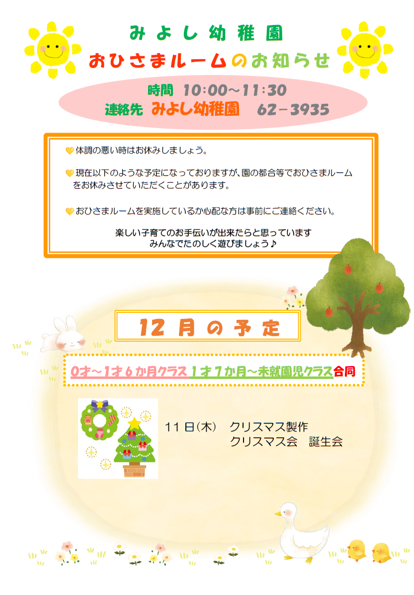 🐤12月のおひさまルームのお知らせ🐤(みよし幼稚園)