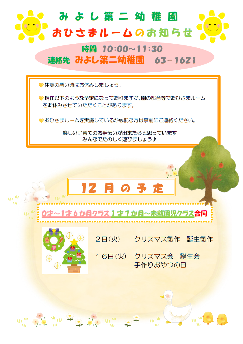 🐤12月のおひさまルームのお知らせ🐤(みよし第二幼稚園)